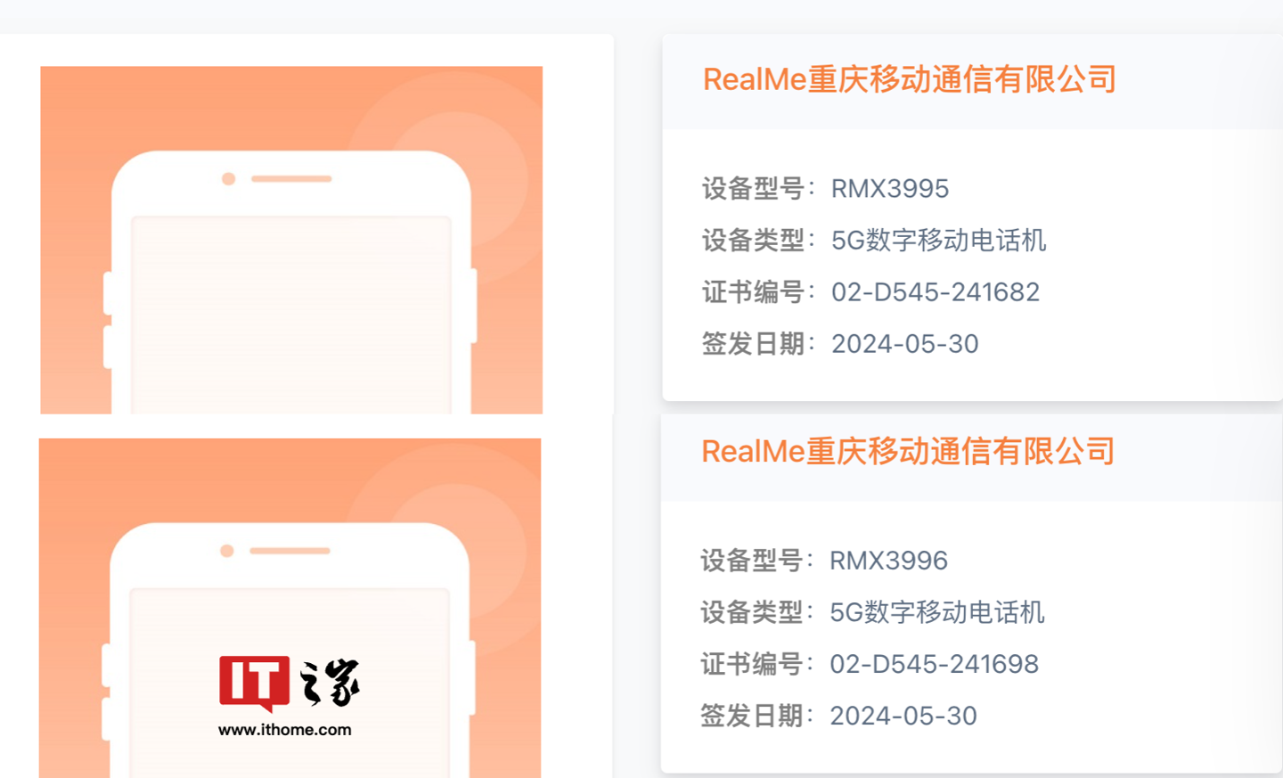 5 月 11 日,真我 RMX3995 / 3996 手机也获得了 CMIIT 无线电发射设备型号核准。