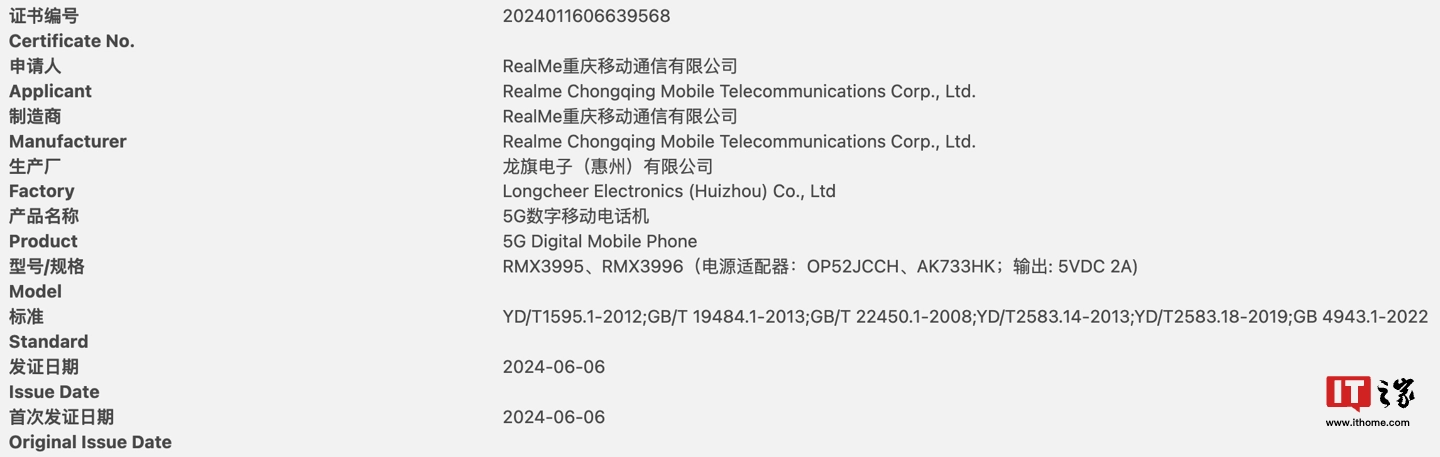 IT之家 6 月 9 日消息,真我 realme 新款入门级 5G 手机 RMX3995 / 3996 现已“三证齐全”,搭载 5000mAh 电池与 720p 屏幕,支持 10W 充电。