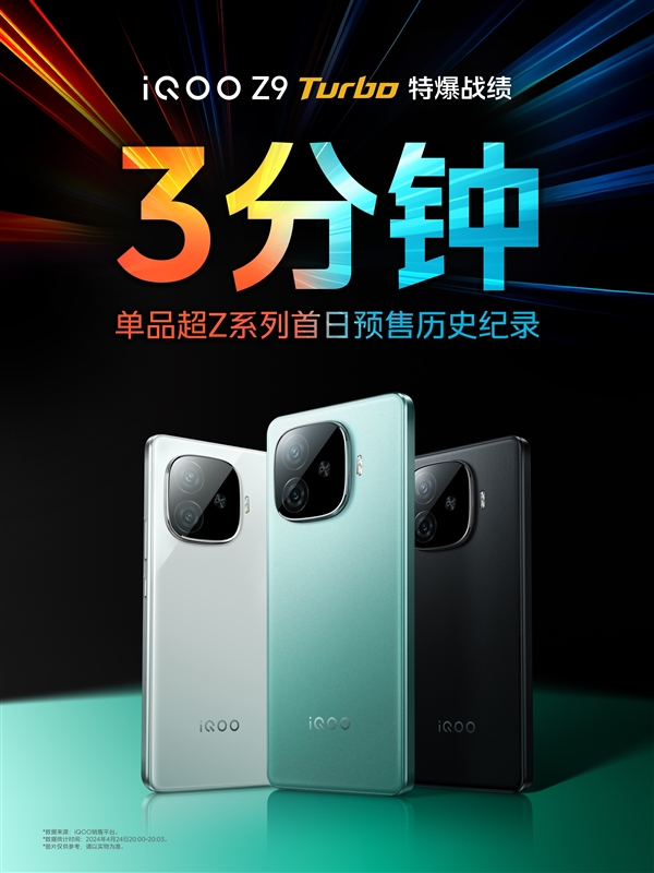 快科技4月24日消息,今日晚间,iQOO公布了iQOO Z9 Turbo预售战绩,该机3分钟预售销量打破Z系列首日预售历史纪录,起售价是1999元。
