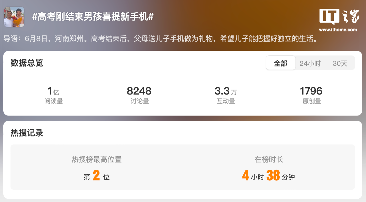 IT之家 6 月 9 日消息,随着 2024 年高考落下帷幕,今天微博“高考结束父母送儿子手机预祝考得漂亮”、“高考刚结束男孩喜提新手机”等话题冲上热搜,截至发稿相关话题登上热搜榜第二,阅读量超过 1 亿。