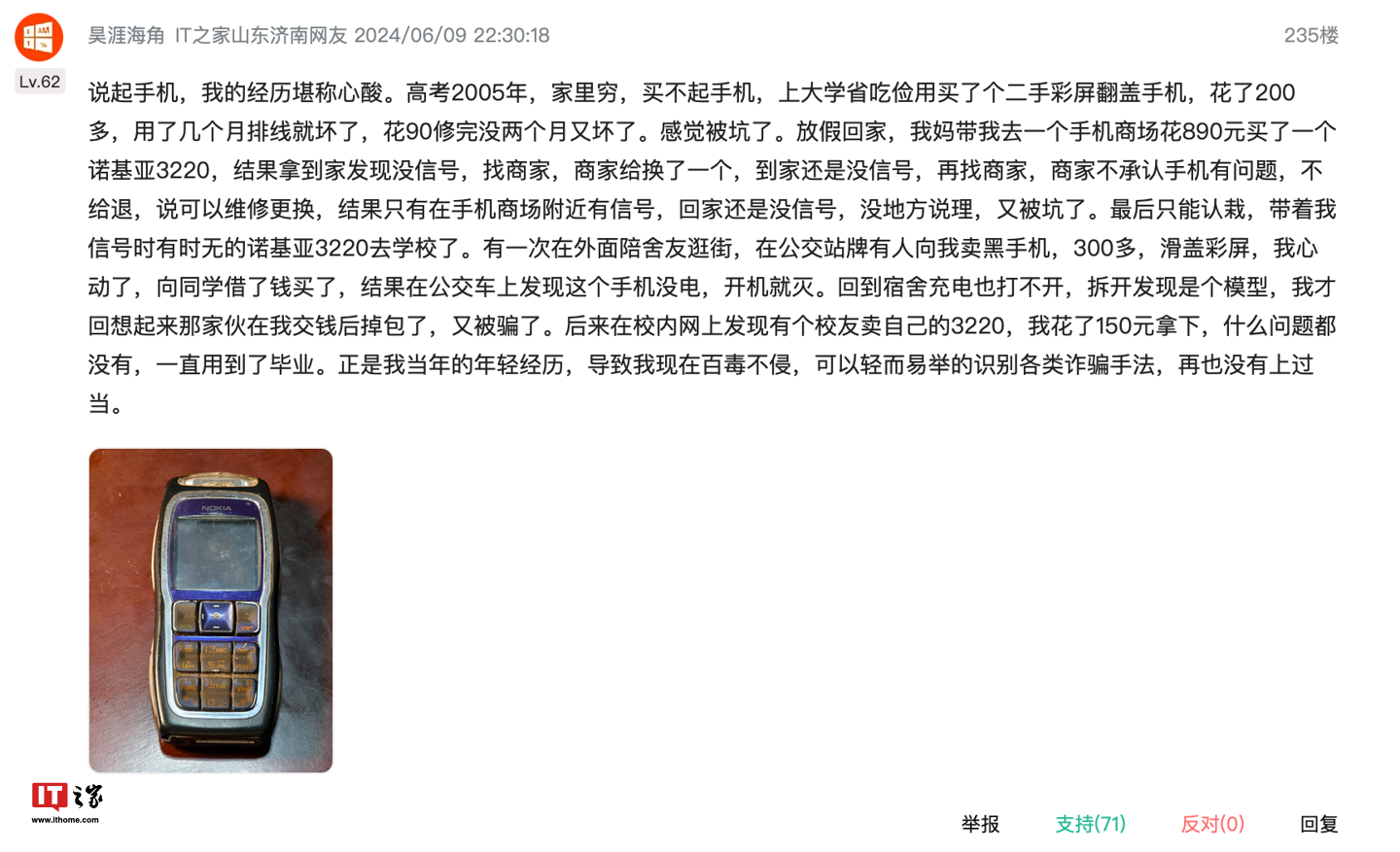 高考 2005 年,家里穷,买不起手机,上大学省吃俭用买了个二手彩屏翻盖手机,花了 200 多,用了几个月排线就坏了,花 90 修完没两个月又坏了。感觉被坑了。放假回家,我妈带我去一个手机商场花 890 元买了一个诺基亚 3220,结果拿到家发现没信号,找商家,商家给换了一个,到家还是没信号,再找商家,商家不承认手机有问题,不给退,说可以维修更换,结果只有在手机商场附近有信号,回家还是没信号,没地方说理,又被坑了。最后只能认栽,带着我信号时有时无的诺基亚 3220 去学校了。