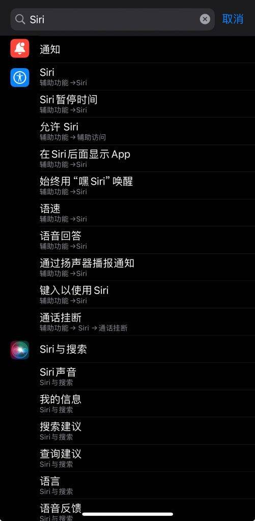 设置的搜索也会进一步优化。目前的搜索有时候无法搜索到一些子页面,比如说 iPhone 15 机型新增加的「充电优化」。有时候搜索一些关键词,联想的优先度也很古怪,例如搜索「Siri」,排在前面的不是主页的「Siri 与搜索」选项,而是辅助功能中不太会用得到的 Siri 功能。