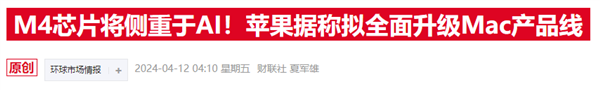 财联社4月29日讯(编辑 赵昊)昨日,知名苹果爆料人马克·古尔曼(Mark Gurman)表示,有消息称苹果可能会在下周发布M4芯片,并把搭载该芯片的新款iPad Pro定位为首款“真正由人工智能(AI)驱动的设备”。