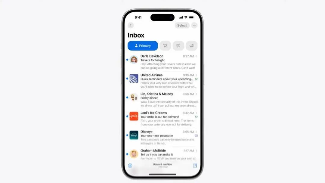 iOS 18 上的邮件功能,可以通过设备分类来控制和管理传入的电子邮件,分类功能可以阻止用户的新消息,并且帮助个人旗下所有的账户都保持最新的消息状态,不错过任何一条重要信息。