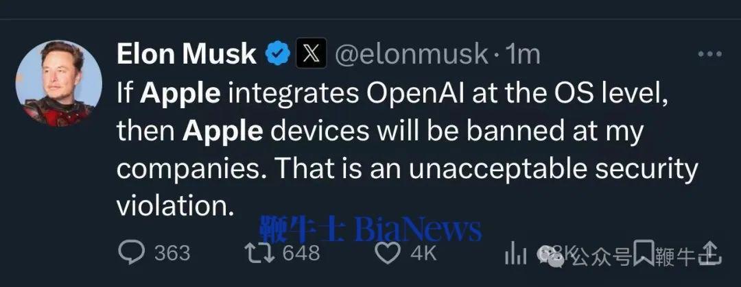 搞事情专家马斯克更是直言,称苹果这家公司无法开发人工智能,同时表示,如果苹果在操作系统层面整合 OpenAI,那么苹果设备将被我的公司禁止使用。这是不可接受的安全违规行为。