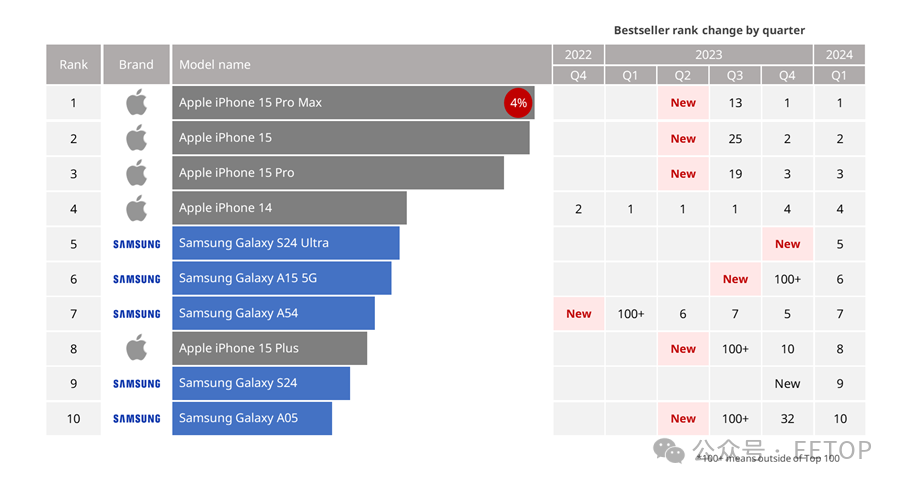 数据显示苹果和三星在2024年第一季度进一步巩固了他们在智能手机市场的前10名地位,各自占据了5个位置,合计占据了整个智能手机市场的22%。