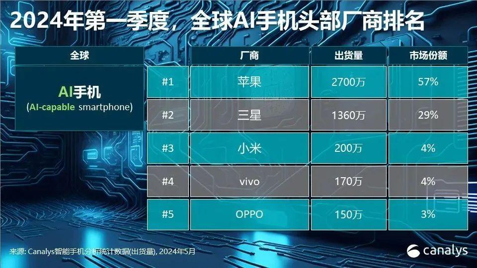 不过,虽然目前的AI手机,大多还是假AI 手机,但还是有机构Canalys统计了当前这些进入第一阶段、第二阶段的手机出货量情况,然后进行了排名。