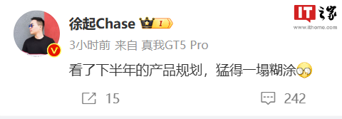 同时IT之家也注意到,真我 realme 副总裁、全球营销总裁、中国区总裁徐起上午也发微博提到“看了下半年的产品规划,猛得一塌糊涂”,为下半年产品进行预热。