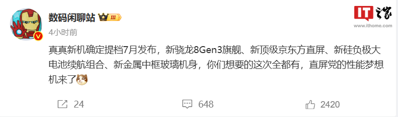 IT之家 6 月 11 日消息,博主 @数码闲聊站 今天爆料了一款真我新机的配置信息,这款新机将配备“骁龙 8 Gen 3 旗舰芯片、新顶级京东方直屏、新硅负极大电池续航组合、新金属中框玻璃机身”,“realme 真我新机确定提档 7 月发布”。
