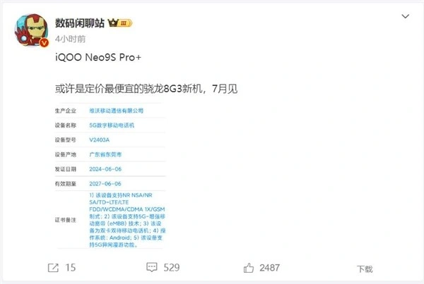 据知名数码博主@数码闲聊站 最新发布的信息显示,近日一款型号为V2403A的iQOO新机获得了入网许可,该机就是已经得到一些曝光的全新iQOO Neo9S Pro+,将在7月登场。结合此前相关爆料,该机将搭载骁龙8 Gen3旗舰平台,该博主还进一步透露称其将会是定价最便宜的骁龙8 Gen3手机,这也意味着此前为安卓旗舰标配的骁龙8 Gen3旗舰平台正式下放给中端机型。