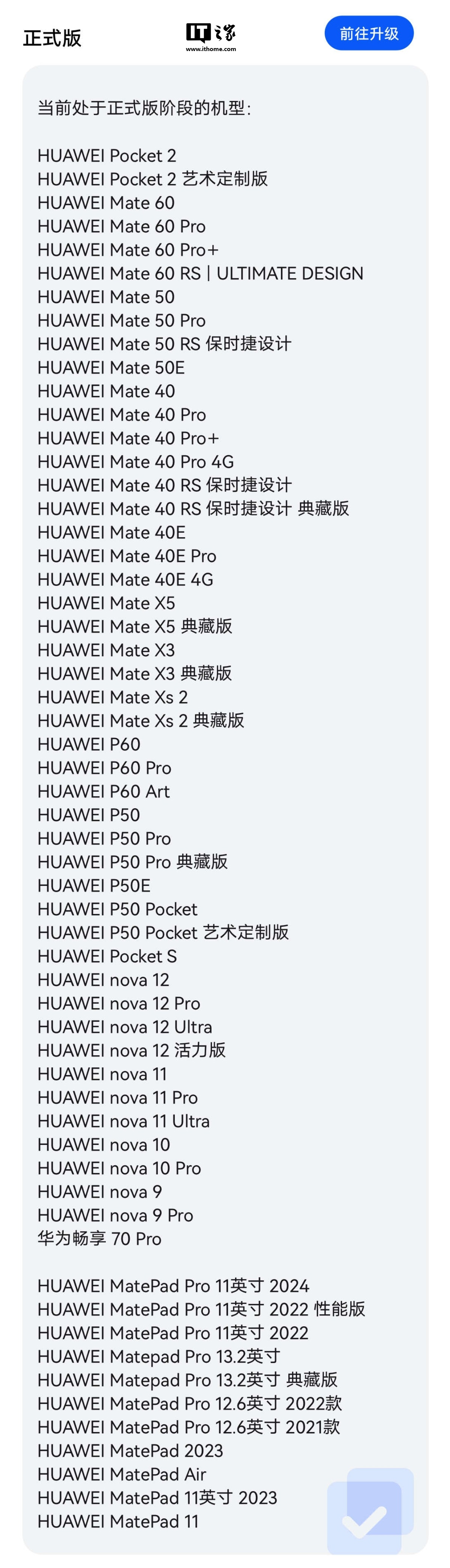 目前处于鸿蒙 HarmonyOS 4.2 正式版系统的机型如下: