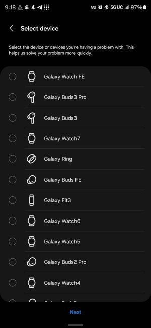在该应用程序的诊断部分,Galaxy Buds 3 和 Buds 3 Pro 被列在了设备列表中。这款程序可以帮助用户查找解决可穿戴设备问题的方案。通常情况下,设备名称旁会显示相应的图标,而最新版本中,可以看到新耳机的图标换成了一个带有柄的样式。