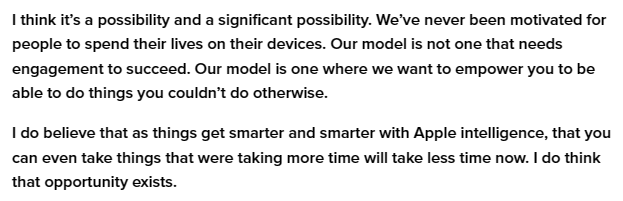 当被问到 Apple Intelligence 的不断发展是否会让人们减少使用 iPhone 时,库克认为这是一个很大的可能性:“我认为这是一个可能性,而且可能性很大。我们从来就没有想过让人们把时间都花在设备上。我们的商业模式并不是依赖用户的使用时长来成功的。我们希望赋予用户能力,让他们能够完成以前无法完成的事情。随着 Apple Intelligence 变得越来越智能,许多以前需要花费大量时间的事情现在都可以更快地完成。我认为这是一个巨大的机遇。”