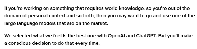 IT之家注意到,谈到将 ChatGPT 集成到 iOS 18 与 OpenAI 的合作时,库克表示:“对于需要用到世界知识储备的任务,也就是超出个人经验范围的任务,你可能更愿意使用市面上的一些大型语言模型。我们选择 OpenAI 和 ChatGPT 是因为我们认为它们是最好的,不过每次使用时都需要获得用户同意。”
