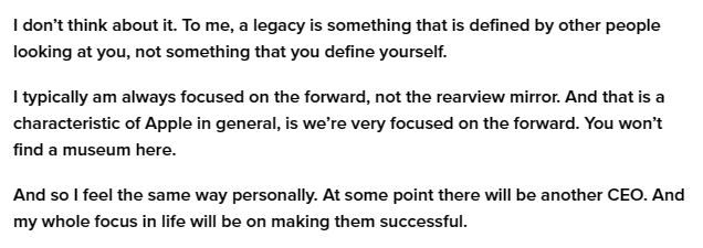 MKBHD 还询问了库克作为苹果 CEO 的 legacy(历史影响)会是什么。库克回答道:“我从来不会去想这些。我认为 legacy 是别人看待你时定义的,而不是你自己定义的。我通常总是向前看,而不是去看后视镜。这也是苹果的一贯特点,我们总是着眼于未来,你在这里看不到博物馆。我个人也是这样想的。在某个时候,肯定会有另一位 CEO 接任,我毕生的目标就是帮助他们取得成功。”