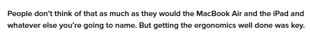 最后,采访还谈到了妙控鼠标。库克表示:“人们不像谈论 MacBook Air、iPad 或者其他产品那样经常谈论妙控鼠标,但是做好人体工程学设计是关键。”