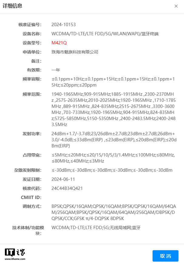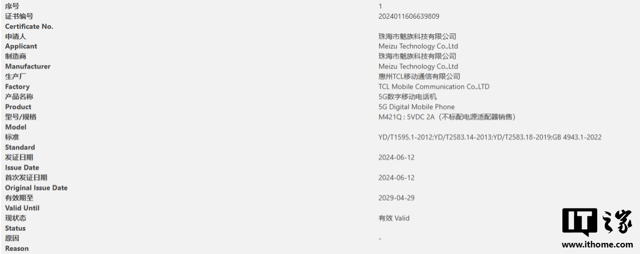 IT之家 6 月 13 日消息,魅族现有一款型号为 M421Q 的机型通过了国家 3C 认证以及无线电核准,显示由惠州 TCL 移动通信有限公司代工,支持 10W 充电功率,且不标配电源适配器销售。