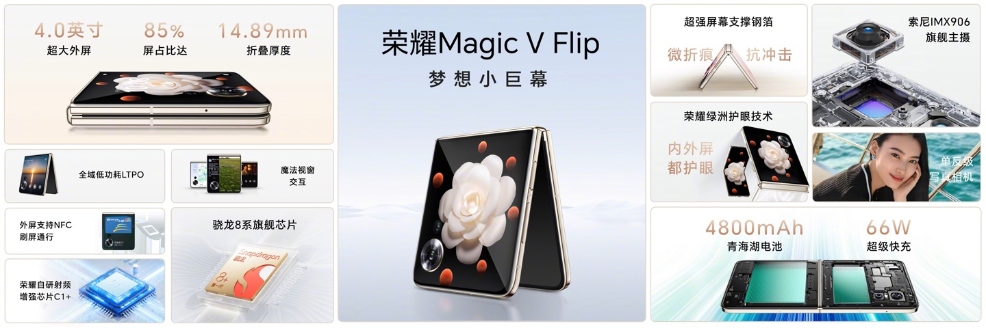 京东方表示,荣耀 Magic V Flip 采用京东方全新柔性折叠低功耗技术解决方案,在耐用性、便携性和续航等方面得到全面增强。