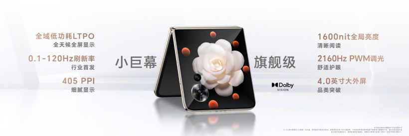 内屏方面,该屏幕尺寸为 6.8 英寸,采用无偏光片技术,在屏幕封装层外形成一层超薄的高透光、低反射膜替代偏光片,大幅提升屏幕的透光率,获得高亮高色域的折叠显示效果、低功耗的显示性能。同时,该屏支持 1-120Hz 多频刷新率模式,双方联合开发了低功耗组合技术方案,具备轻薄、小折痕、耐用等特点。