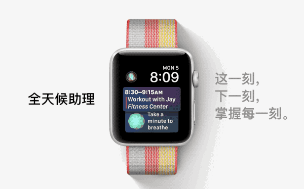 用户只需要滚动数码表冠,一整天的事件行程与其他重要信息,都简要地显示在了表盘上。