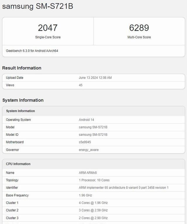三星 Galaxy S24 FE 手机将采用低频版 Exynos 2400 芯片,最近泄露的 Geekbench 跑分显示,该芯片拥有 10 核 CPU,主频为 3.1 GHz。核心频率和架构与 Exynos 2400 相同,只是 X4 核心的频率为 3.1 GHz,而不是 3.2 GHz。