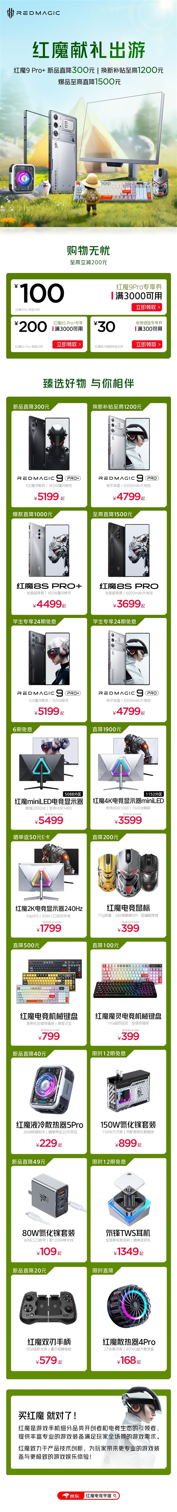 其他产品,电竞键鼠最高降500元,电竞耳机1349元起,氘锋氮化镓充电器109元起,红魔散热器5 Pro降价40元,双刃手柄降价20元。