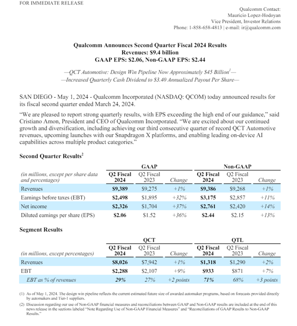 快科技5月2日消息,高通今天发布了2024年第二财季财报,受中国手机市场复苏的推动,业绩相当不错。