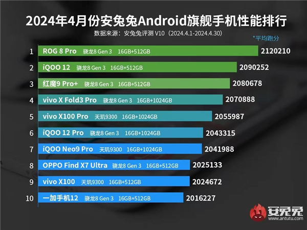 具体来看,第一名是ROG 8 Pro,平均跑分2120210;第二名是iQOO 12,平均跑分2090252;第三名是红魔9 Pro+,平均跑分2080678,第四名是vivo X Fold3 Pro,平均跑分是2070888。