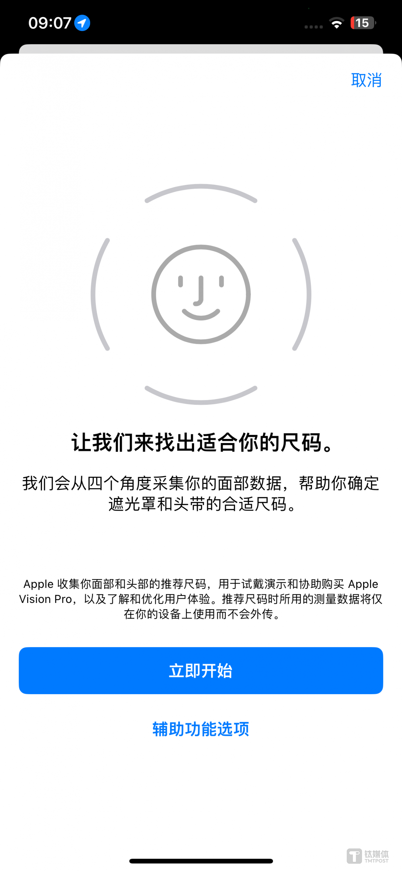 6月14日早上9点,钛媒体APP在实际体验后发现,和此前的购买流程一样,购买Apple Vision Pro时需要先通过iPhone或者iPad对你的面容进行扫描,从而推断出适合的尺寸。之后,针对视觉情况填写一个调查问卷,包括是否佩戴眼镜、是否做过矫正手术等,以推荐合适的镜片。最后,便是存储、Apple Care+等服务的选择。