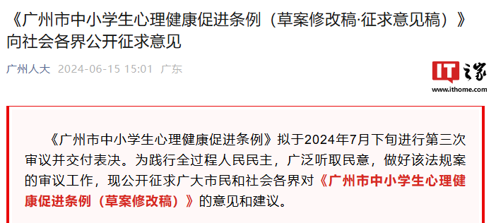 IT之家 6 月 16 日消息,6 月 15 日,广州市人大官网及公众号挂出《广州市中小学生心理健康促进条例(草案修改稿・征求意见稿)》向社会各界公开征求意见和建议。