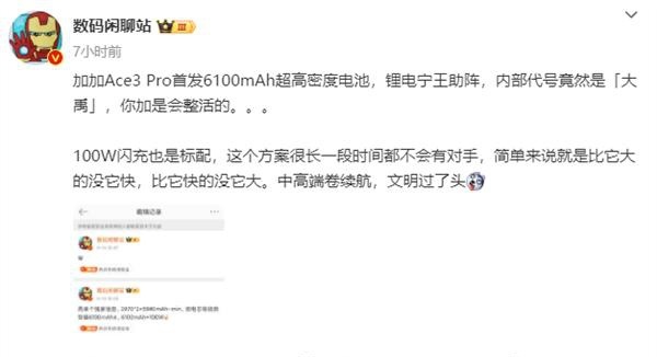 之前爆料显示,这款电池密度极高,让一加 Ace3 Pro比前代更轻薄的同时,达到了6100mAh,提升了1100mAh。