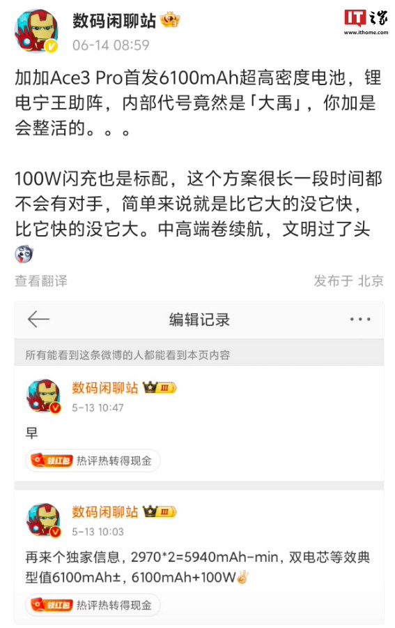 博主 @数码闲聊站 不久前也曾放出爆料:一加 Ace3 Pro 手机将首发 6100mAh 超高密度电池,锂电宁王助阵,内部代号“大禹”,标配 100W 闪充。