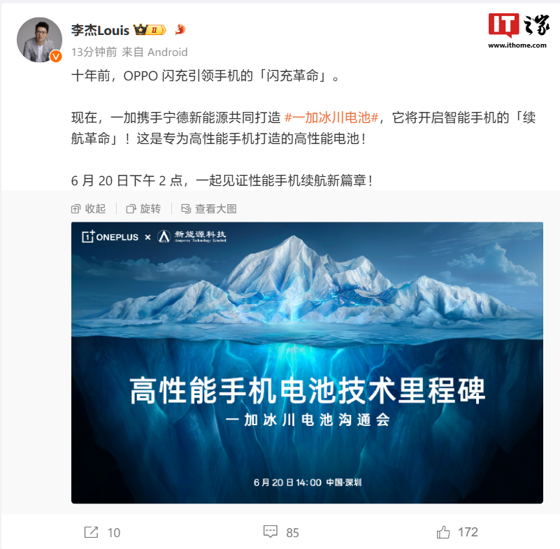 IT之家 6 月 17 日消息,一加中国区总裁 @李杰 Louis 今天上午发文宣布,一加携手宁德新能源共同打造的一加冰川电池将开启智能手机“续航革命”。李杰更称,这是专为高性能手机打造的高性能电池。