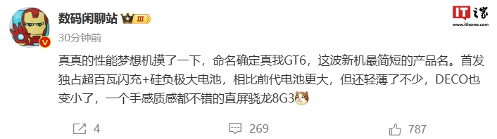 博主 @数码闲聊站 今日发文爆料:realme 性能梦想机确定命名 GT6,该手机首发独占超百瓦闪充 + 硅负极大电池。相比前代,该机电池更大、机身更轻薄,DECO 也变小了,采用直屏设计,搭载高通骁龙 8 Gen3 处理器。