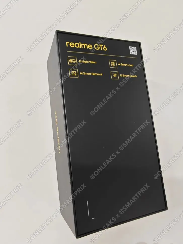 realme 真我 GT6 手机海外版本包装已经曝光,包装盒标有四项 AI 功能,包括:AI 夜视(AI Night Vision)、AI Smart Loop、AI Smart Removal、AI Smart Search 等功能。