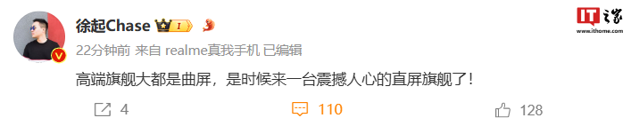文章来源于互联网:IT之家-realme 徐起官宣直屏旗舰,消息称真我 GT6 手机首发独占超百瓦闪充 + 硅负极大电池