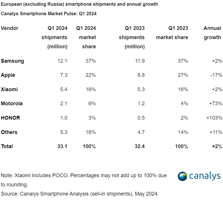 报告显示,除苹果外,2024 年第一季度欧洲(不包括俄罗斯)智能手机市场其他品牌出货量均呈现出上升趋势,其中荣耀与摩托罗拉分别以 103% 和 73% 同比增长率,表现出强劲的增长势头。