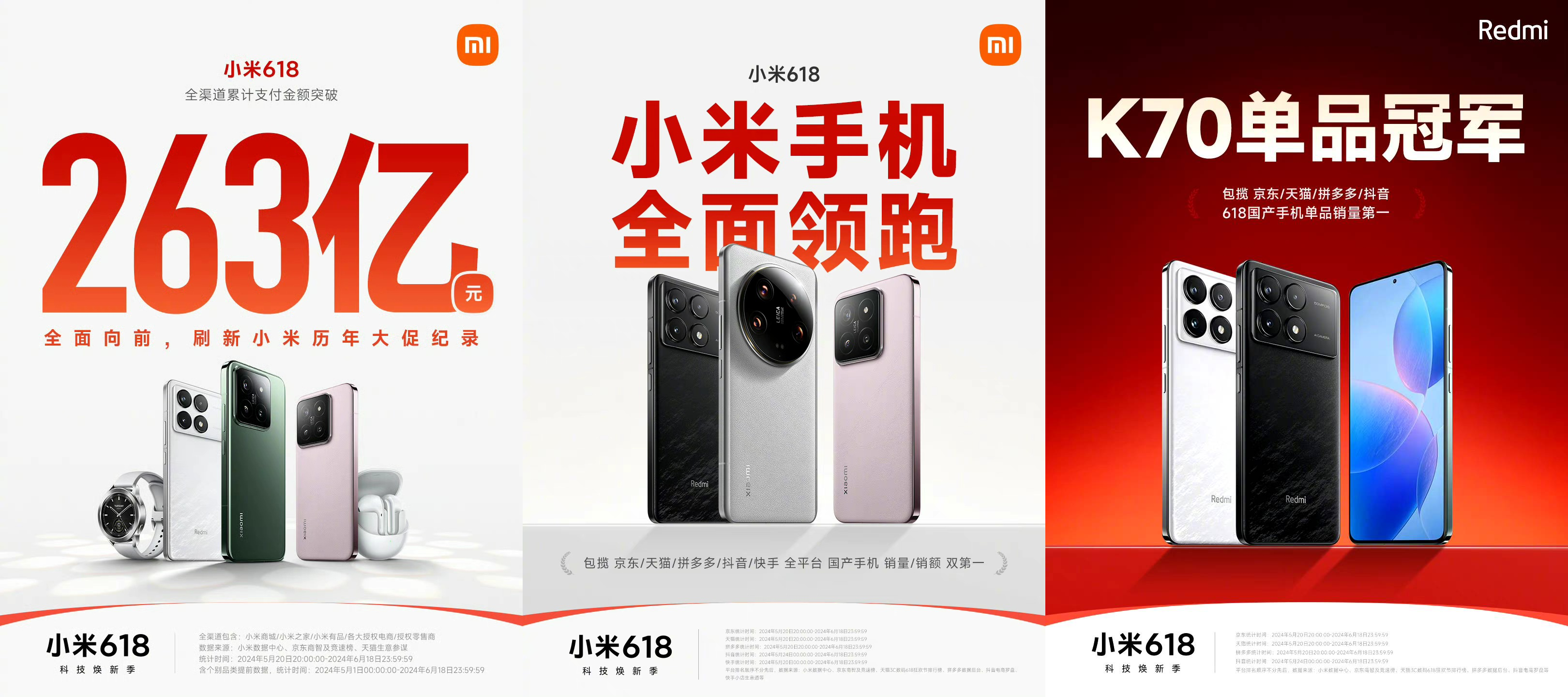 截至6月18日24时,2024年小米618大促全渠道累计支付金额突破263亿元人民币,刷新小米历年大促新纪录,再创历史新高。手机品类全面领跑,包揽京东、天猫、拼多多、抖音、快手等平台国产手机销量及销额双第一,Redmi K70单品摘得京东、天猫、拼多多、抖音、快手等全平台618国产手机销量第一。