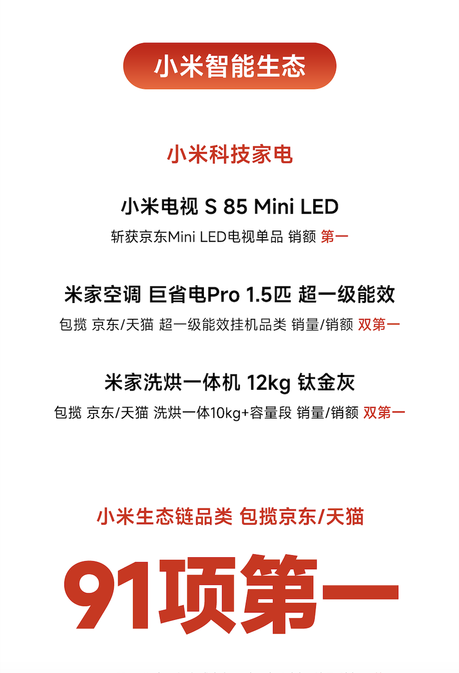 除了手机业务之外,小米智能生态也表现亮眼。小米科技家电方面,包括电视、空调、洗衣机等获得多个第一。小米电视S 85 Mini LED斩获京东在该品类的销额冠军,米家空调巨省电Pro1.5匹超一级能效包揽京东天猫双平台超一级能效挂机品类销量、销额双冠。AIoT业务表现同样可圈可点。小米生态链品类包揽了京东和天猫双平台91项第一。其在净水器、空气净化器、扫地机器人、摄像头、烟灶、智能门锁等多个品类的销售额,也都突破了1亿元。小米新零售表现强劲且亮眼,小米之家销额同比增长17%,手机销量同比增长21%。线上线下即时零售业务累计销额达成6.5亿元,手机销量同比增长56%。
