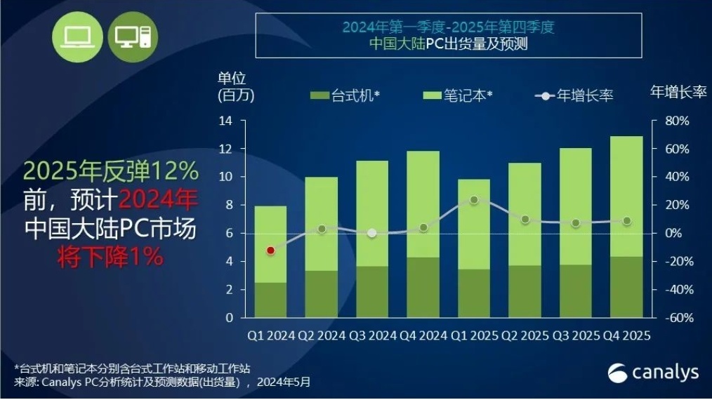 【环球网科技综合报道】6月19日消息,市场分析机构Canalys最新报告显示,2024年中国大陆个人电脑(PC)市场预计将出现1%的轻微下滑,但2025年有望迎来强劲反弹,预计PC出货量将增长12%。