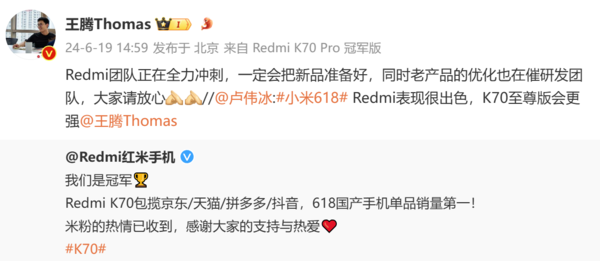 6月19日,小米集团合伙人、总裁,国际部总裁,小米品牌总经理卢伟冰转发了Redmi官方发布的海报,并且暗示Redmi K70至尊版会更加出色。不久后,Redmi品牌总经理王腾转发了该微博,称Redmi团队正在全力冲刺,一定会把新品准备好。而针对此前不少网友吐槽的小米系统问题,王腾也进行了回应,表示已经督促研发团队做好老产品的优化,大家请放心。