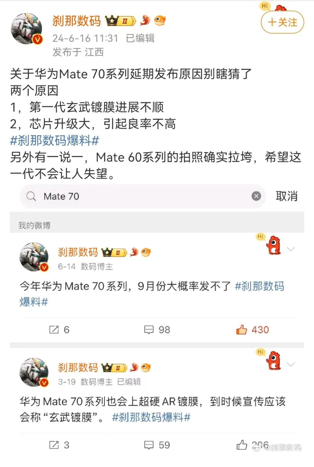 第三次是在 6 月 16 日,他解释了关于华为 Mate 70 系列延期发布的原因,声称有两点。