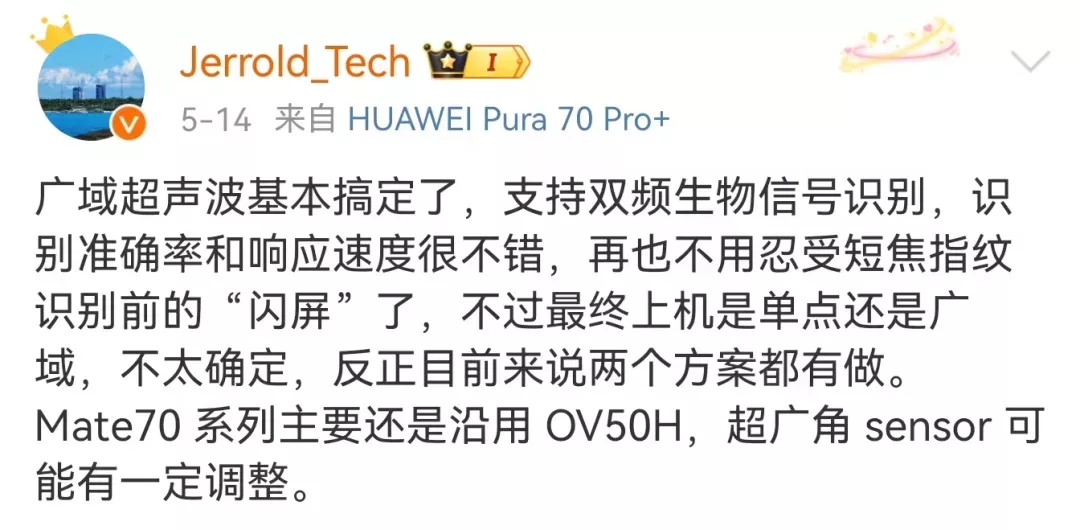 今年的 Mate 70 系列,有变化方案的可能,博主 @ Jerrold-Tech 曾放料,华为基本搞定了超声波方案,Mate 70 系列有概率使用。