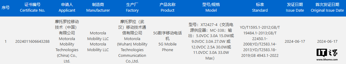 IT之家查询获悉,一款型号为 XT2427-4 的新款摩托罗拉手机于 6 月 17 日通过国家 3C 认证,支持 33W 快充。据科技媒体 gizmochina 报道,这款新品为摩托罗拉 S50 Neo。