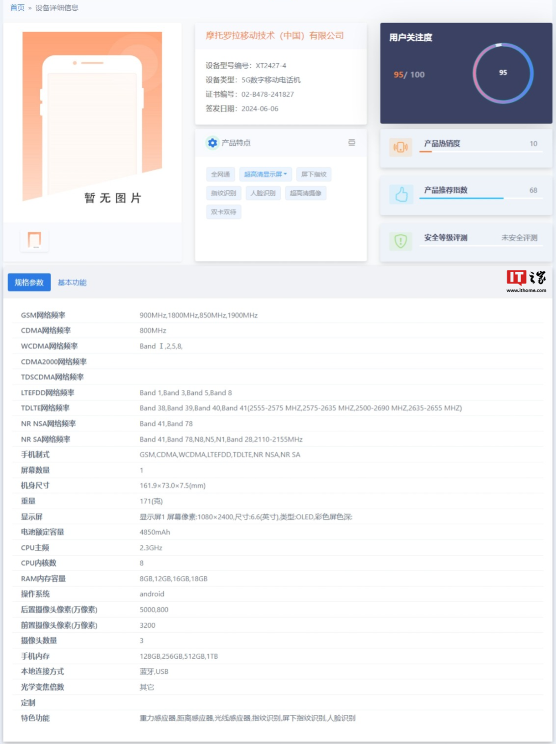 电信设备终端网显示该设备更多详情信息,摩托罗拉 S50 Neo 拥有 128GB / 256GB / 512GB / 1TB 四种存储版本可选;后置一颗 5000 万像素和一颗 800 万像素摄像头,前置 3200 万像素镜头;机身尺寸为 161.9×73.0×7.5mm。