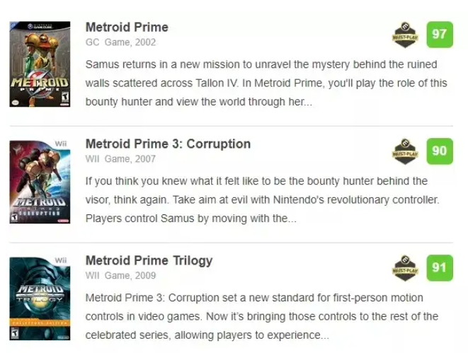 《 密特罗德 》系列经历了几十年的演变,从一开始的 2D 平台跳跃变成了后来的 3D ,但是在画面、关卡设计、剧情、战斗等各个方面全是经典,随便一个续作在 M 站都是 90 以上的高分。