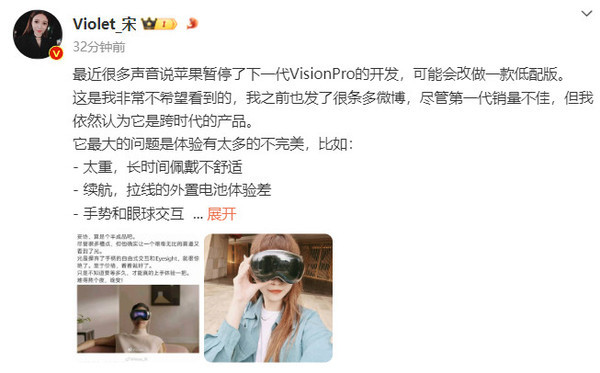 【CNMO科技消息】日前,有报道称苹果将暂停下一代高端头显Vision Pro的开发工作,转而将开发一款更亲民的产品,功能更少但价格更便宜。6月20日,原iQOO产品经理、现理想汽车产品策略主管宋紫薇发文评价此事。她表示:这是我非常不希望看到的。