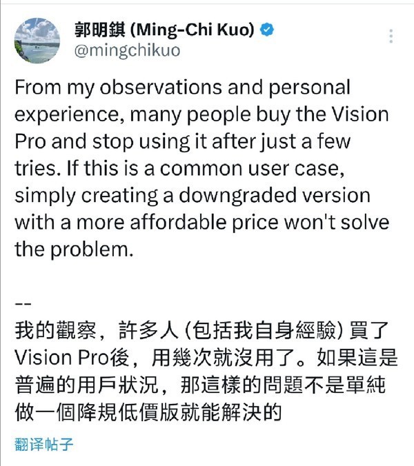 除了宋紫薇,此前知名苹果分析师郭明錤也发表了自己的看法。他认为开发廉价版无法解决Vision Pro使用率偏低的问题。郭明錤认为,Vision Pro使用率低不是单纯做一个降规低价版就能解决的。郭明錤表示,Vision Pro销量不佳的原因,主要还是当前该设备的生态和使用场景非常有限,价格贵或许是一个原因,但还不是最主要原因。