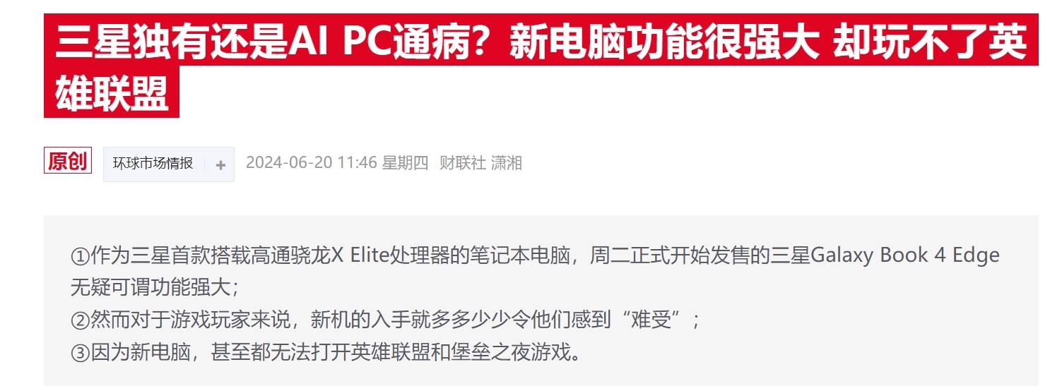 搭载骁龙X Elite芯片的三星Galaxy Book4 Edge在本周二正式上市,随后三星马上发布公告称,这款新电脑上无法运行多款主流软件,包括对硬件要求不高的《英雄联盟》,以及《堡垒之夜》、《EA FC Online》等多款游戏。