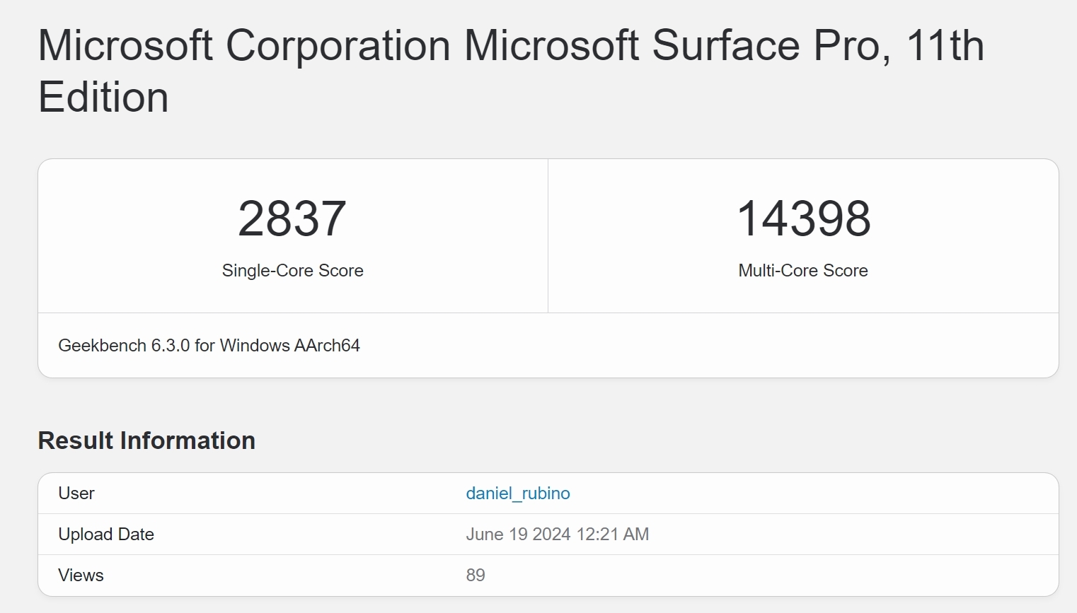 Geekbench数据显示,搭载骁龙X Elite芯片的微软Surface Pro 11单核跑分2837,多核达到1.4万。横向对比,苹果入门级别的M3 MacBook Air单核跑分能够超过3000,多核分数平均接近1.2万。骁龙X Elite芯片有12个核心,而M3只有8核,但多核跑分只低了20%。